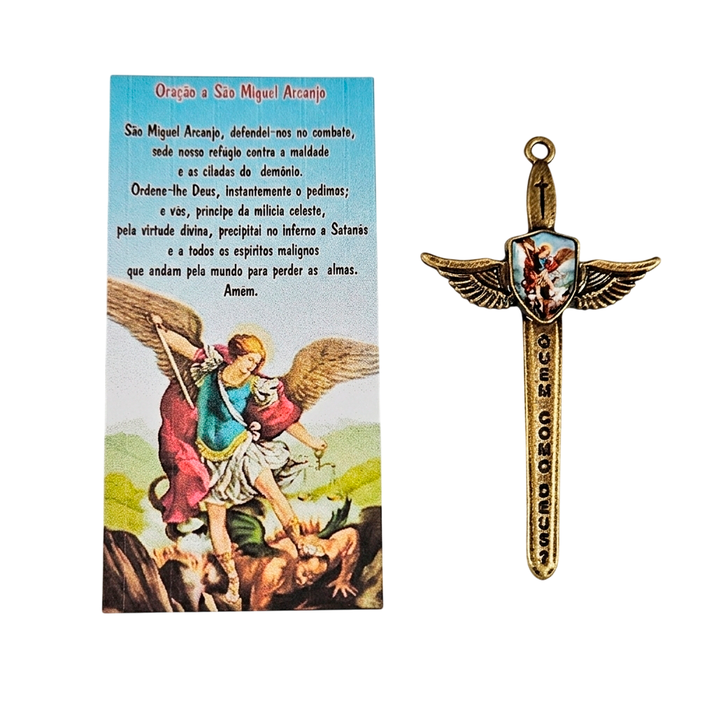 Pingente Espada de São Miguel Arcanjo em Metal, com 7,2cm de altura por 4,1cm de largura.