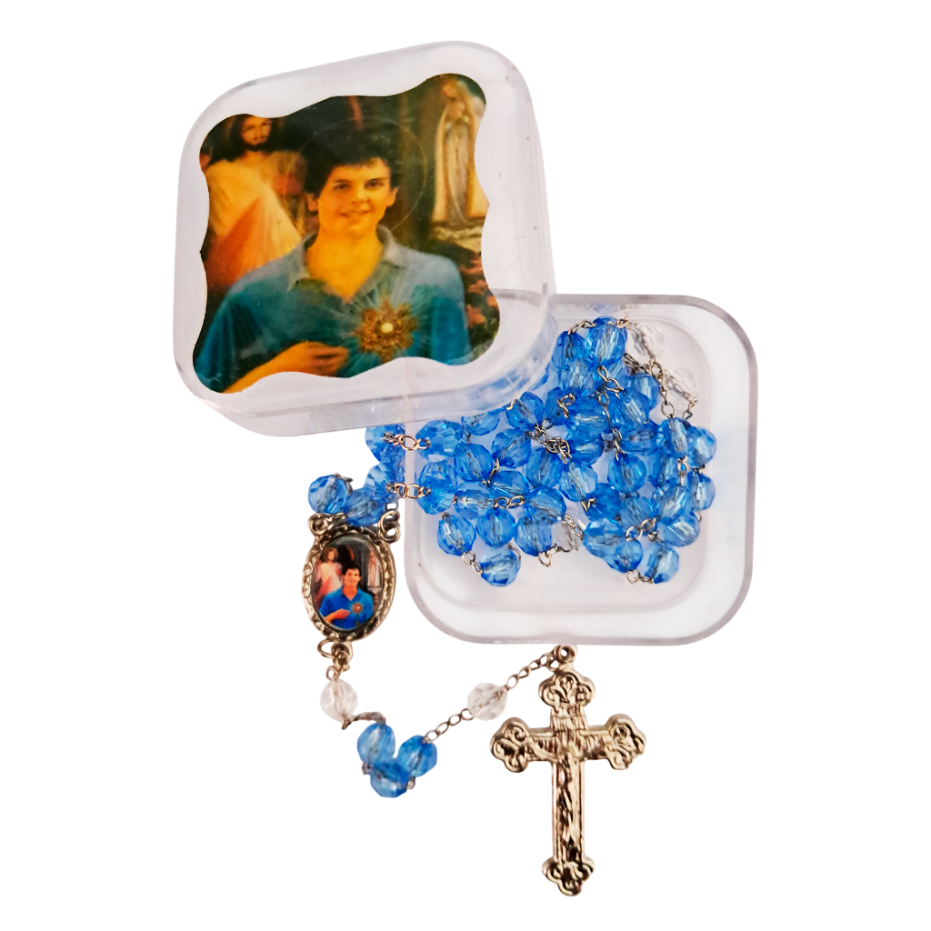 Terço acrílico com caixa plástica, cruz e entremeio em metal.
