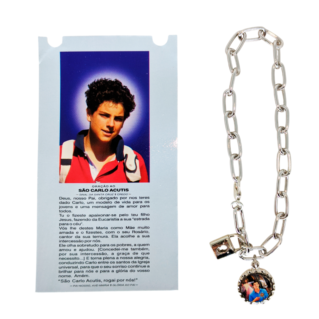 Pulseira consagração de São Carlo Acutis com 23 cm. A pulseira de aço, medalha e cadeado de níquel.