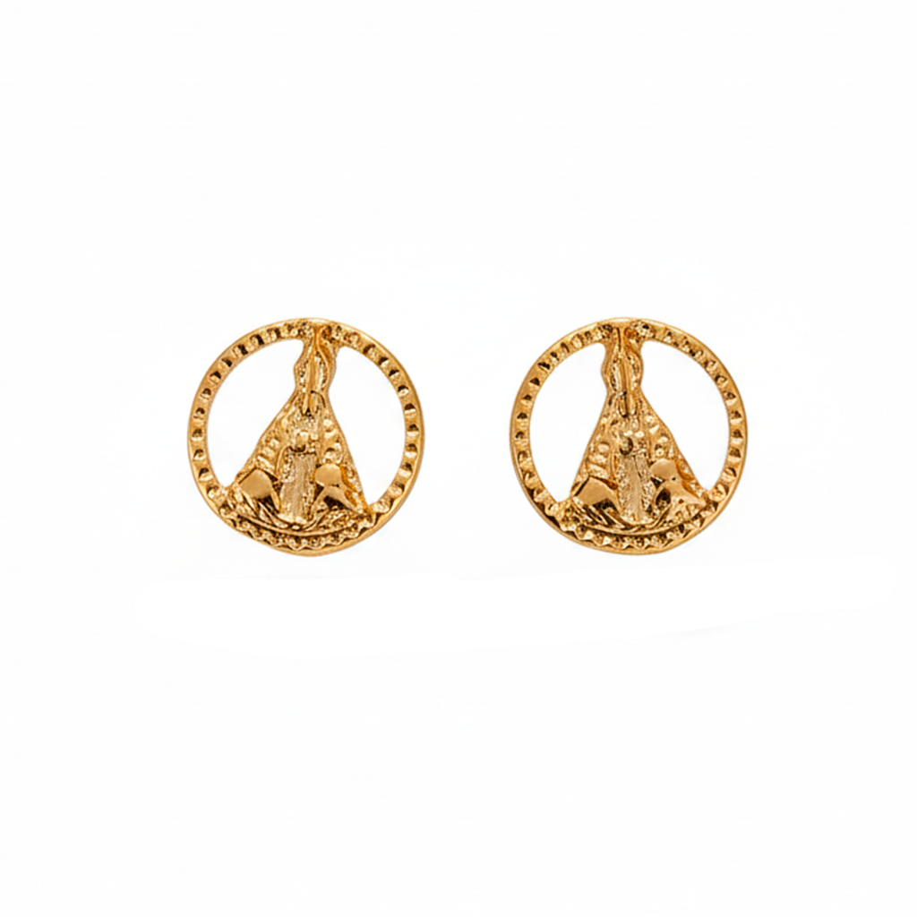 Brinco dourado com circulo de Nossa Senhora Aparecida.