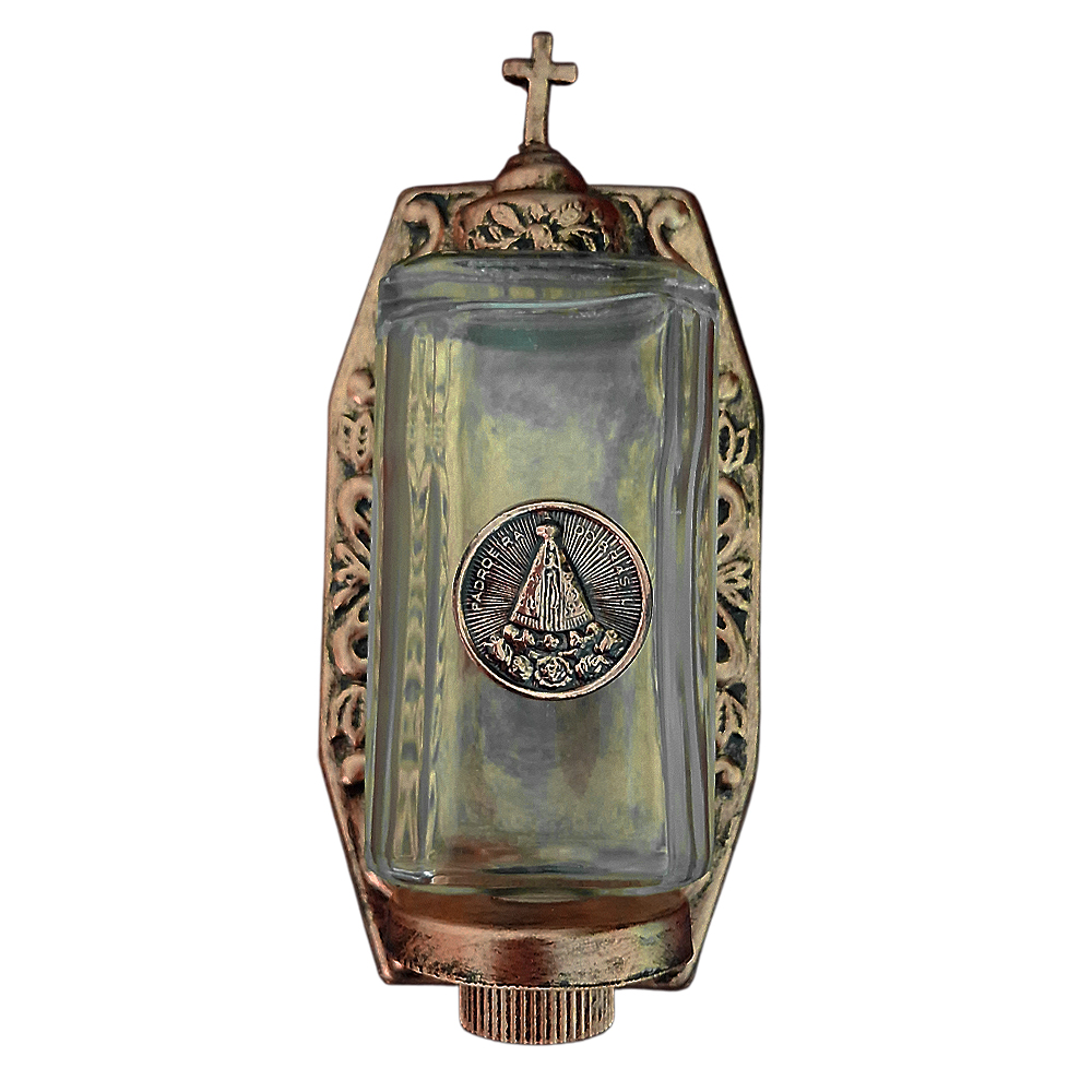 Em metal e vidro. Pintada na cor "Ouro Velho" (não é ouro de verdade, é apenas o nome da cor).