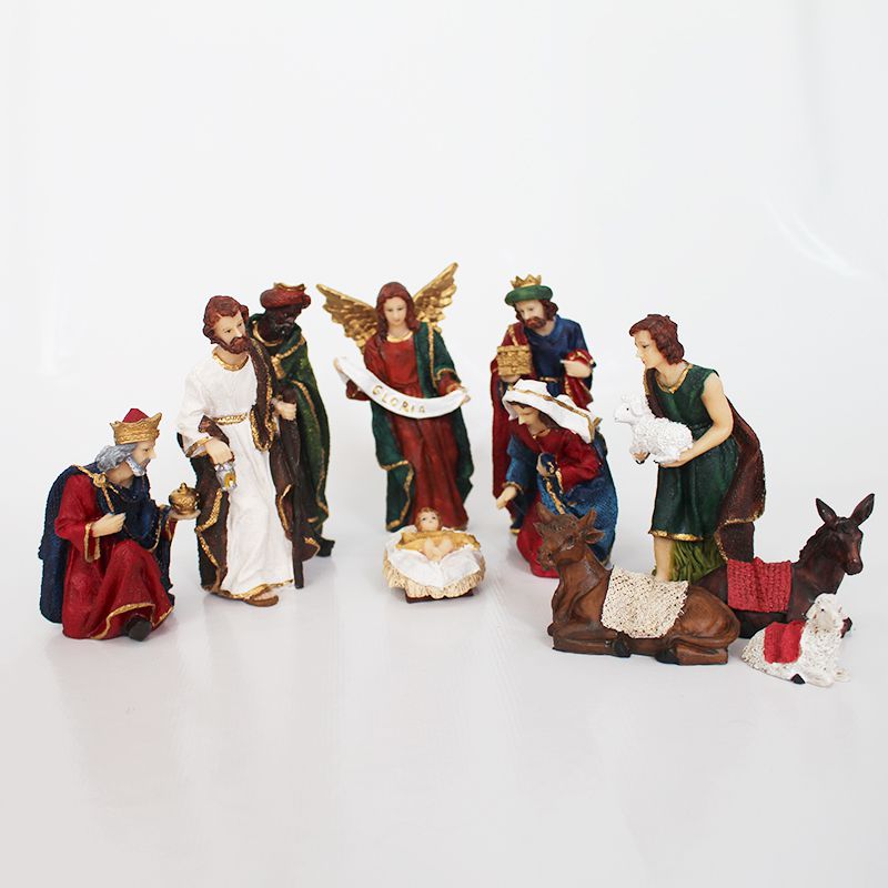 Presépio de 11 peças em resina colorido. Tamanho das peças de 15,0cm a 4,0 cm.