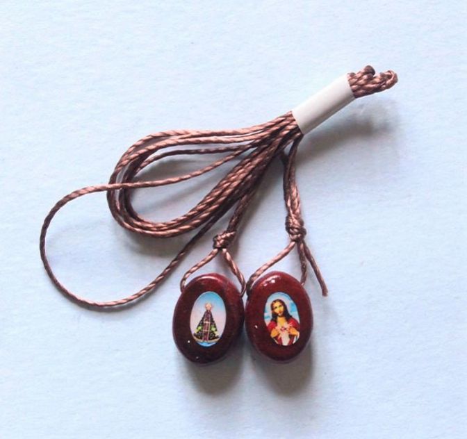 Escapulário em madeira resinada, Sagrado Coração de Jesus e Nossa Senhora Aparecida.